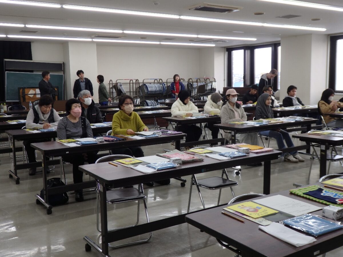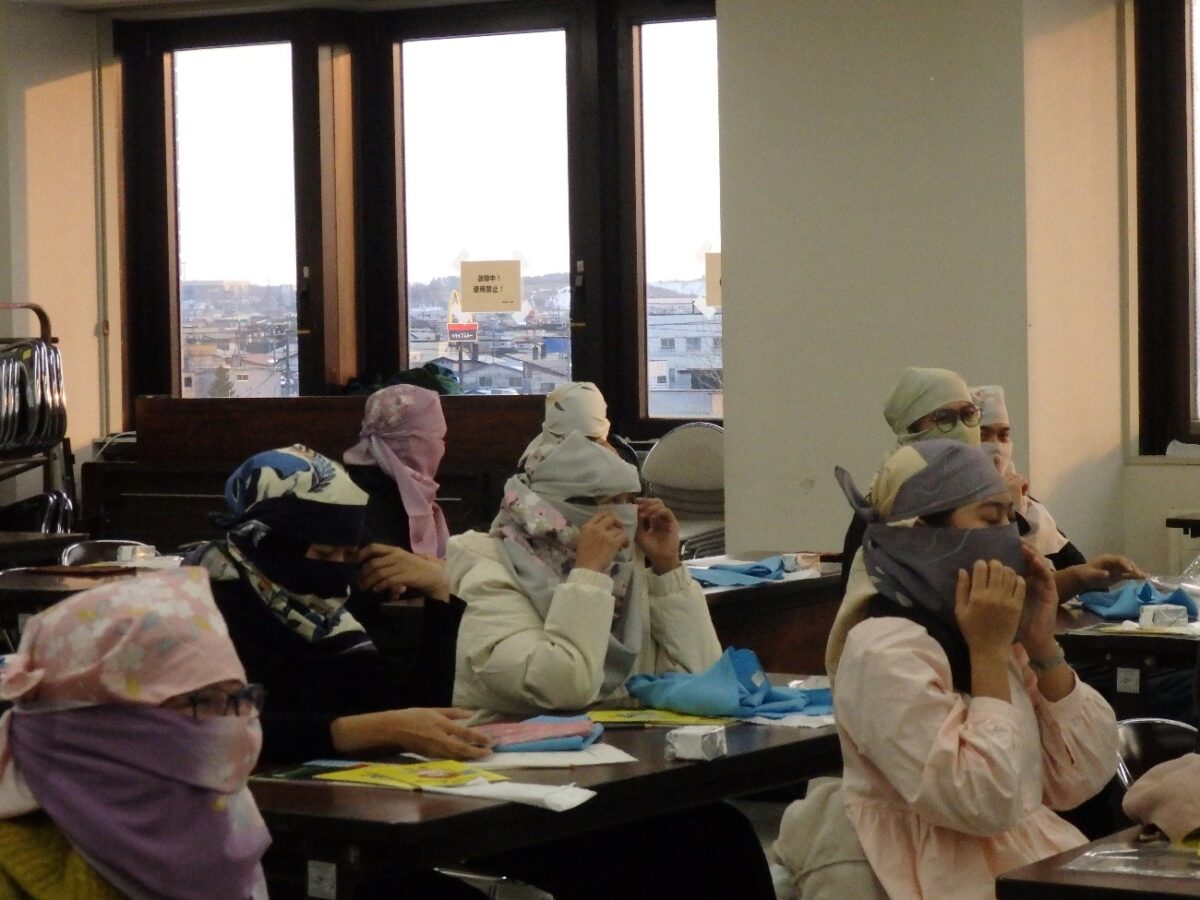 外国籍住民向けでしたが、サハリンからの永住帰国者の皆さんもぜひとのことで、皆さんに呼びかけました。始めに(公社)北海道国際交流協力総合センター(HIECC)の小田島道朗氏の「防災基礎知識講座」を聞き、北海道の自然災害と災害時の基本的な行動を学びました。次に(一社)日本風呂敷文化協会代表理事の横山芳江氏による「命を守る防災風呂敷講座」で1枚の布である「ふろしき」が包帯になったり、荷物を運んだり、頭を守ったりと、災害の時にも活躍することを学びました。